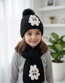 Qızlar üçün papaq + şərf dəsti sz014, qara, yun, 5-11 yaş |