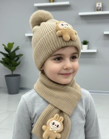 Oğlanlar üçün papaq + şərf dəsti sz014, bej, yun, 5-11 yaş |