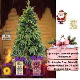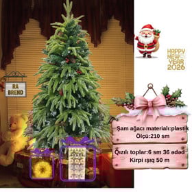 Şam ağacı yeni il üçün RAX27-07, qarlı, 210 sm + 36 əd 6 sm-lıq qızılı oyuncaq və dekorativ işıq 50 m Hədiyyə