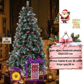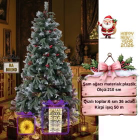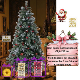 Şam ağacı yeni il üçün RAX305, qarlı, 210 sm + 36 əd 6 sm-lıq qırmızı oyuncaq və dekorativ işıq 50 m Hədiyyə |