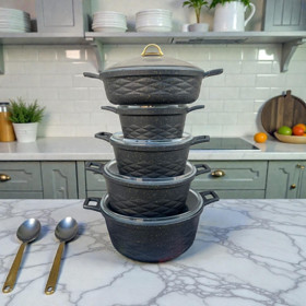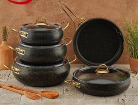 Qazan dəsti, qara, Türkiyə istehsalı, yüksək keyfiyyətli 4 mm qalınlıq, 9 parça, Alman texnologiyası (Jreblon), ölçülər: dərin 20 sm, dərin 24 sm, dərin 28 sm, dayaz 28 sm, tava 28 sm - TW-RZ568