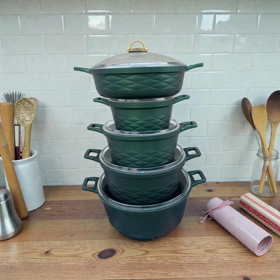 Qazan dəsti, tökmə granit, yanmaz yapışmaz, qalınlıq 4 mm, antibakterial parex qapaqlar, qulp gövdəyə bitişik, sobada istifadəyə yararlı, tutacaqlar gold metal, spiral alt hissə, ölçülər: 20/24/28/32 sm qazanlar, 28 sm karnıyarık, yaşıl - TW-RZ580