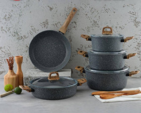 Qazanlar dəsti, boz rəng, Türkiyə istehsalı, yüksək keyfiyyətli 4 mm qalınlıq, 9 parça (Jreblon), Alman texnologiyası ilə hazırlanıb, ölçülər: dərin 20 sm, dərin 24 sm, dərin 28 sm, dayaz 28 sm, tava 28 sm - TW-RZ572