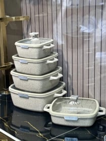 Qazan dəsti YM-7562013, kvadrat, qranit, 5 parça, bej mərmər teksturalı - YM-7562013