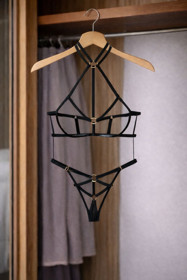 Qadın üçün zərif kəmər üslublu fantazi geyim ikili dəst ŞHN-0502 , qara , poliester/elastan , ölçü L |